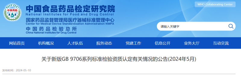 中檢院發(fā)布新版GB 9706系列標準檢驗資質(zhì)認定有關(guān)情況的公告(2024年5月)