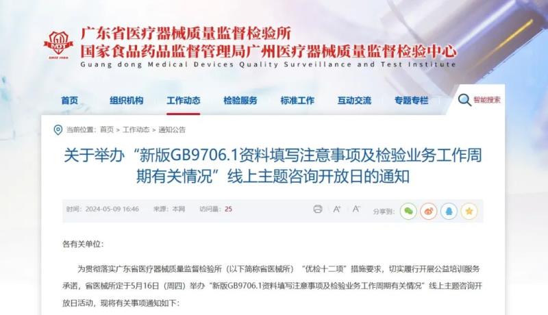 近日,廣東省醫(yī)療器械質(zhì)量監(jiān)督檢驗所官網(wǎng)發(fā)布通知,定于5月16日(周四)舉辦“新版GB 9706.1資料填寫注意事項及檢驗業(yè)務(wù)工作周期有關(guān)情況”線上主題咨詢開放日活動,具體時間及參會方式如下: