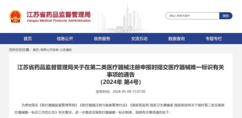 隨著第三批醫療器械唯一標識實施日期的臨近,近日,江蘇省藥監局發布《關于在第二類醫療器械注冊申報時提交醫療器械唯一標識有關事項的通告(2024年 第4號)》,具體如下: