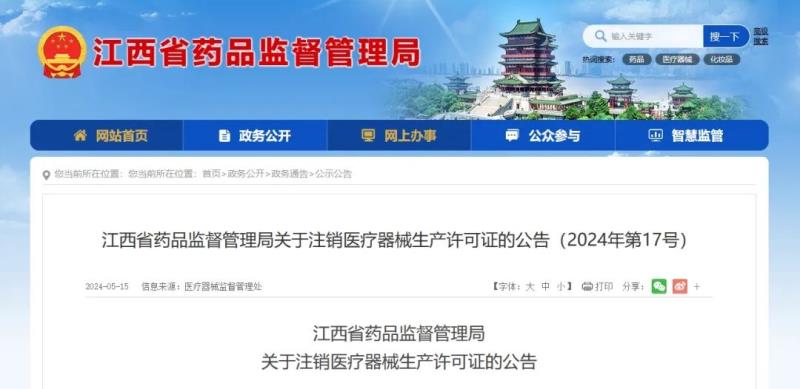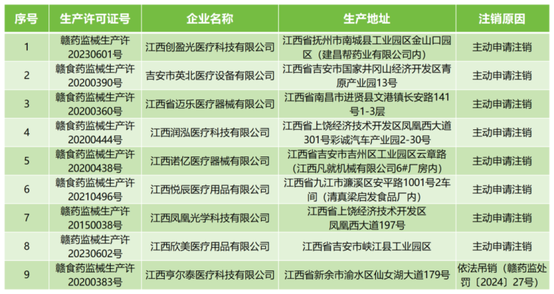 5月15日,江西省藥監局官網發布一則醫療器械生產許可證注銷公告,公告顯示,該局已依法注銷江西創盈光醫療科技有限公司、江西省邁樂醫療器械有限公司等9家企業的醫療器械生產許可證,其中8家為主動申請注銷,1家為依法吊銷,具體明細如下: