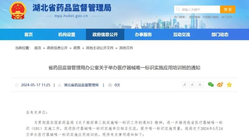5月17日,湖北省藥監局發布通知稱,該局定于2024年5月24日舉辦醫療器械唯一標識實施應用培訓班。相關培訓信息具體如下: