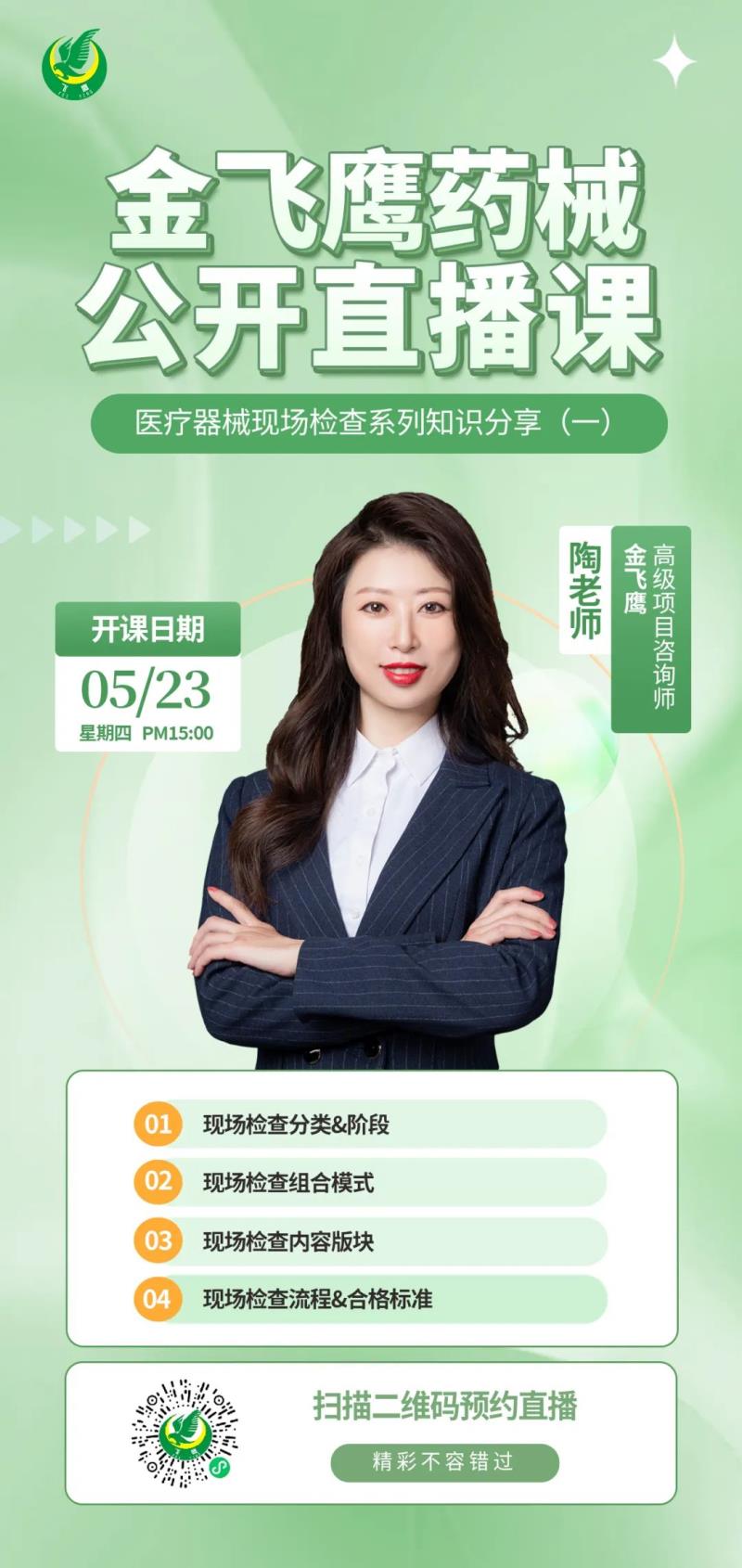 5月23日下午3點,金飛鷹高級項目咨詢師,負責過多種醫療器械產品國外委托生產&國內技術轉移項目,有著眾多醫械產品現場檢查經驗的陶老師,給大家帶來《醫療器械現場檢查系列知識分享(一)》,培訓內容包括場檢查分類&階段、現場檢查組合模式、現場檢查內容版塊、現場檢查流程&合格標準,相關企業千萬不要錯過了哦!