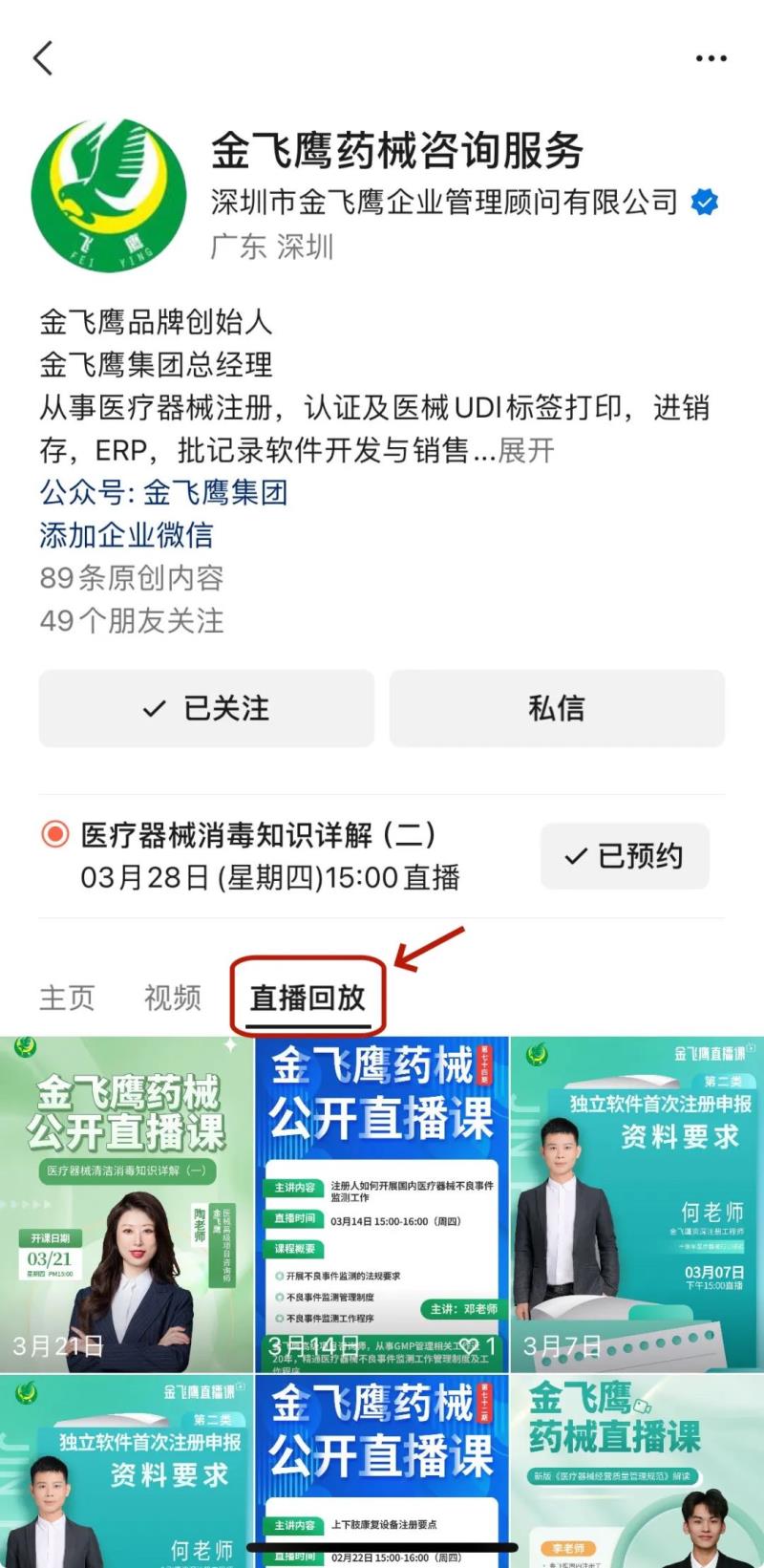 往期直播培訓課程支持回放,關注“金飛鷹藥械咨詢服務”視頻號并點擊視頻號主頁,即可查看“直播回放”哦~