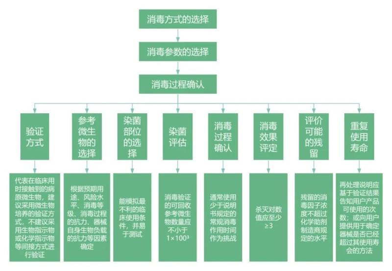 消毒確認(rèn)是可重復(fù)使用醫(yī)療器械再處理過(guò)程的重要環(huán)節(jié),它是通過(guò)物理或化學(xué)的方法清除或殺滅傳播媒介上致病微生物,使其達(dá)到無(wú)害化的處理。其確認(rèn)過(guò)程較為復(fù)雜,大體流程如下: