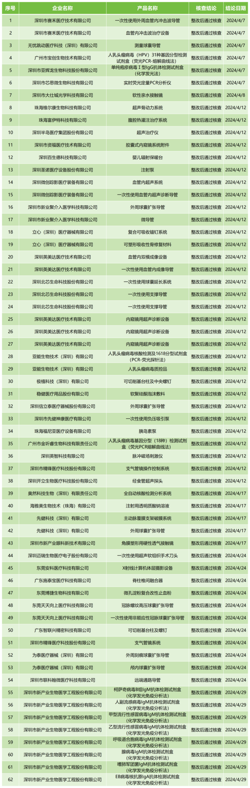 5月21日,廣東省藥監局官網公布2024年4月醫療器械注冊質量管理體系核查結果,包括深圳半島醫療集團股份有限公司的超聲治療儀、海雅美生物技術(珠海)有限公司的注射用透明質酸鈉溶液、珠海福尼亞醫療設備有限公司的胰島素泵等共計62款產品,均為“整改后通過核查”。具體明細見下方表格: