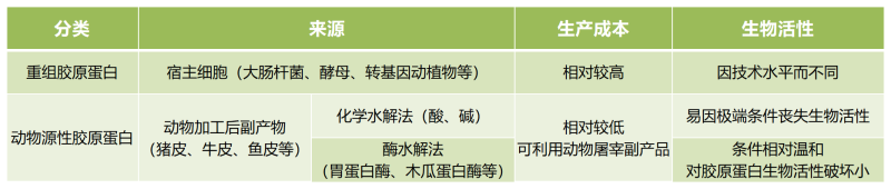 按照來源的不同膠原蛋白可分為重組膠原蛋白和動(dòng)物源性膠原蛋白。重組膠原蛋白為非天然膠原蛋白,由基因工程技術(shù)合成,而動(dòng)物源性膠原蛋白則從動(dòng)物組織中提取。動(dòng)物源性膠原蛋白生產(chǎn)成本較低且生產(chǎn)工藝相對(duì)簡單。而重組膠原蛋白擁有更高的生物活性與生物相容性、更低的免疫原性、更低的漏檢病原體隱患風(fēng)險(xiǎn)、更好的水溶性、無細(xì)胞毒性以及可進(jìn)一步加工優(yōu)化等特點(diǎn),因此其應(yīng)用范圍更加廣泛,受到市場的強(qiáng)烈關(guān)注。