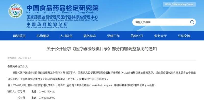 6月3日,國家藥監局醫療器械標管中心發布《關于公開征求〈醫療器械分類目錄〉部分內容調整意見的通知》,并向社會公開征求意見。