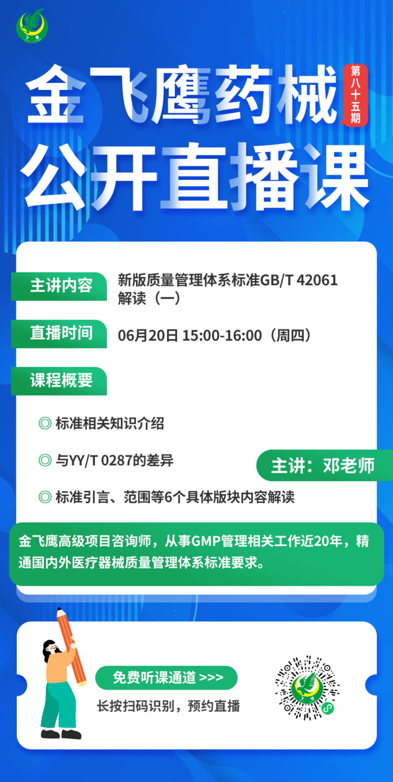 6月20日下午3點,金飛鷹高級項目咨詢師,從事GMP管理相關工作近20年,精通國內外醫療器械質量管理體系標準要求的鄧老師,給大家帶來《新版醫療器械質量管理體系標準GB/T 42061解讀(一)》,培訓內容包括標準相關知識介紹、與YY/T 0287的差異、標準引言/范圍等6個具體版塊內容解讀,醫療器械經營企業千萬不要錯過了哦!