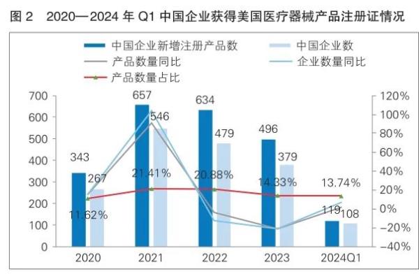 2024年一季度,美國醫療器械新增產品注冊數量達866件,同比增長21.12%(詳見圖1),共涉及735家企業(醫療器械制造商)。其中,中國(含香港、澳門及臺灣地區)有108家企業在美獲得119件醫療器械產品注冊證,占美國醫療器械產品新注冊總數的13.74%,產品數量同比增長1.7%(詳見圖2)。