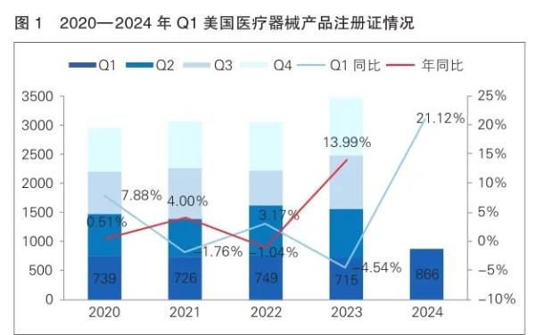 從管理類別來看,2024年一季度,美國醫療器械新增產品注冊數最多的是Ⅱ類器械,產品數量為630件,占比72.75%。