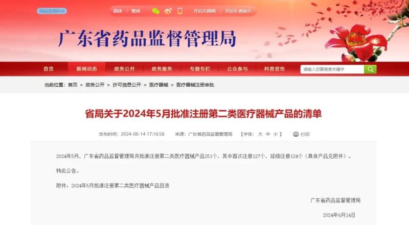 近日,廣東省藥監局發布公告稱,2024年5月,廣東省藥監局共批準注冊醫療器械產品251個,其中首次注冊127個,延續注冊124個。