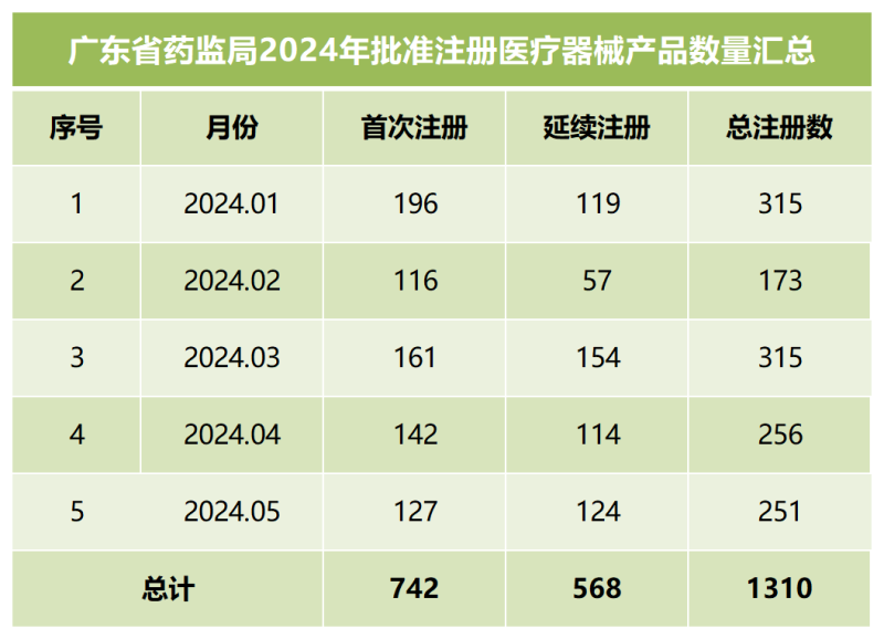 我們同步匯總了2024年前5個月廣東省藥監局批準注冊的醫療器械產品數量(見下方表格),從表格中可以看出,截至5月底,2024年廣東省藥監局總計批準注冊第二類醫療器械產品1310,其中首次注冊742個,延續注冊568