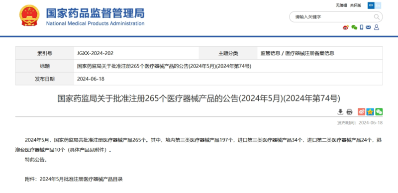 6月18日,國家藥監局官網發布公告稱,2024年5月,國家藥監局共批準注冊醫療器械產品265個其中,境內第三類醫療器械產品197個,進口第三類醫療器械產品34個,進口第二類醫療器械產品24個,港澳臺醫療器械產品10