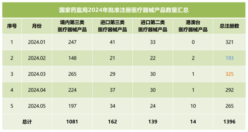 我們同步匯總了2024年前五個月國家藥監局批準注冊的醫療器械產品數量(見下方表格),從表格中可以看出,截至5月,2024年國家藥監局總計批準注冊醫療器械產品1396,其中境內第三類醫療器械產品1081個,進口第三類醫療器械產品162個,進口第二類醫療器械產品139,港澳臺醫療器械產品14個