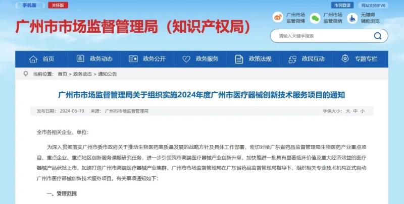 6月19日,廣州市市場監督管理局發布《關于組織實施2024年度廣州市醫療器械創新技術服務項目的通知》(以下簡稱《通知》),《通知》指出,該局已組織相關專業技術機構正式啟動廣州市醫療器械創新技術服務項目。具體事項如下: