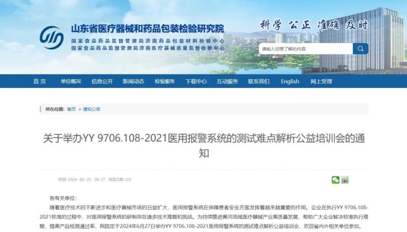 6月20日,山東省醫療器械和藥品包裝檢驗研究院發布通知稱,該院定于2024年6月27日舉辦YY 9706.108-2021醫用報警系統的測試難點解析公益培訓會,此次培訓為線上培訓,省內外相關單位均可報名參加。會議相關事宜具體如下: