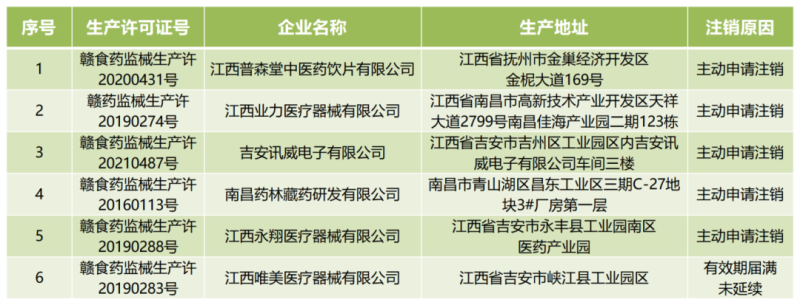 近日,江西省藥監局發布公告稱,由于企業主動申請或有效期屆滿未延續,該局已依法注銷了江西普森堂中醫藥飲片有限公司、江西業力醫療器械有限公司6家企業的《醫療器械生產許可證》具體明細如下: