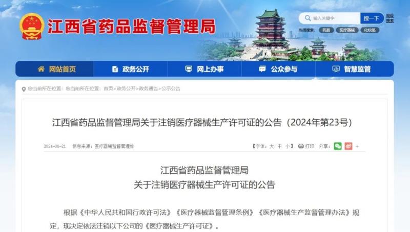 江西藥監局:以下醫療器械生產許可證已被注銷!