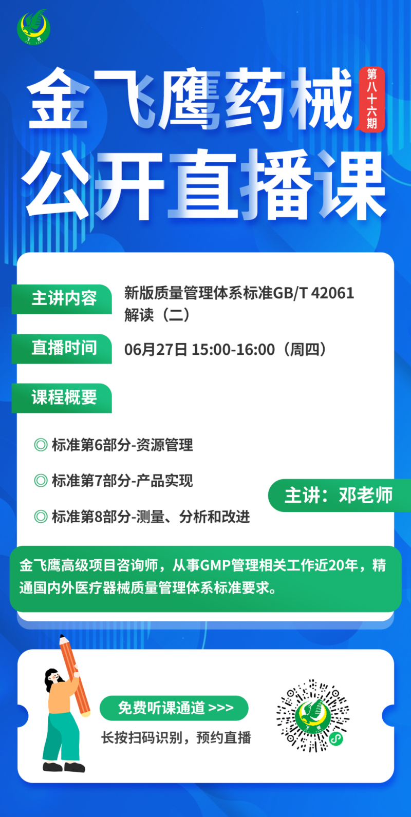 6月27日下午3點,金飛鷹高級項目咨詢師,從事GMP管理相關工作近20年,精通國內外醫療器械質量管理體系標準要求的鄧老師,給大家帶來《新版醫療器械質量管理體系標準GB/T 42061解讀(二)》,培訓內容是標準的第6-8部分(資源管理、產品實現、測量/分析和改進)解讀,大家千萬不要錯過了哦!