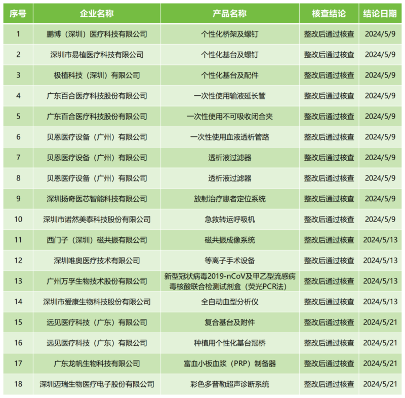 6月25日,廣東省藥監局官網公布2024年5月醫療器械注冊質量管理體系核查結果,包括西門子(深圳)磁共振有限公司的磁共振成像系統、深圳唯奧醫療技術有限公司的等離子手術設備、深圳邁瑞生物醫療電子股份有限公司的彩色多普勒超聲診斷系統共計18款產品,均為“整改后通過核查”。具體明細見下方表格: