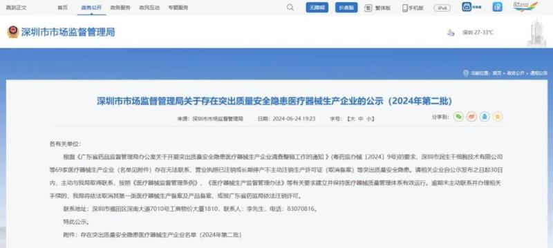 近日,深圳市市場監(jiān)督管理局發(fā)布《關(guān)于存在突出質(zhì)量安全隱患醫(yī)療器械生產(chǎn)企業(yè)的公示(2024年第二批)》,其中指出,深圳市潤生干細(xì)胞技術(shù)有限公司、深圳醫(yī)龍科技有限公司等69家醫(yī)療器械生產(chǎn)企業(yè)存在無法聯(lián)系、營業(yè)執(zhí)照已注銷或長期停產(chǎn)不主動(dòng)注銷生產(chǎn)許可證(取消備案)等突出質(zhì)量安全隱患。