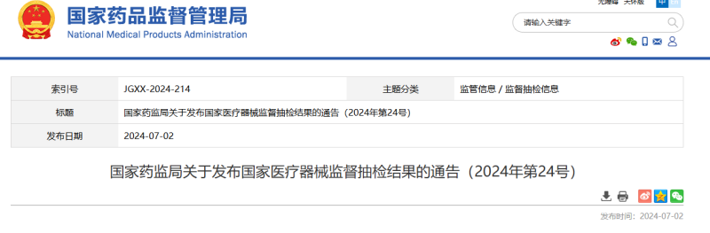 近日,國家藥監局發布關于醫療器械監督抽檢的結果通告: