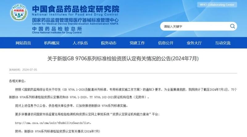 近日,中檢院官網公布了截至2024年7月1日,75個新版GB 9706系列標準檢驗資質認定情況和GB 9706.1-2020、YY 9706.102-2021獲證機構信息。