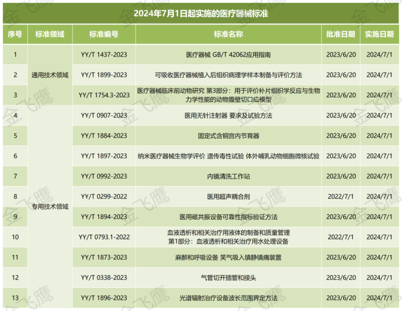 自2024年7月1日起正式實施的共有13項醫療器械標準,其中最值得大家關注的是YY/T 1437-2023《醫療器械 GB/T 42062應用指南》,除此之外YY/T 0907-2023《醫用無針注射器 要求及試驗方法》、YY/T 1896-2023《光譜輻射治療設備波長范圍界定方法》等,具體明細如下: