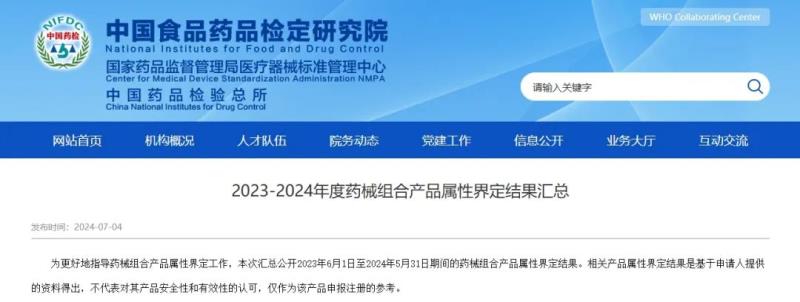 近日,國家藥監局醫療器械標準管理中心發布《2023-2024年度藥械組合產品屬性界定結果匯總》,匯總公開了2023年6月1日至2024年5月31日期間的藥械組合產品屬性界定結果,具體如下:
