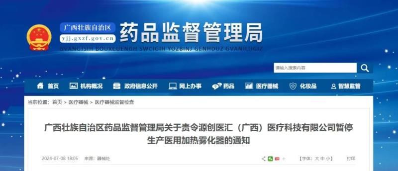 因體系存在嚴重缺陷,廣西一企業被責令暫停生產醫用加熱霧化器