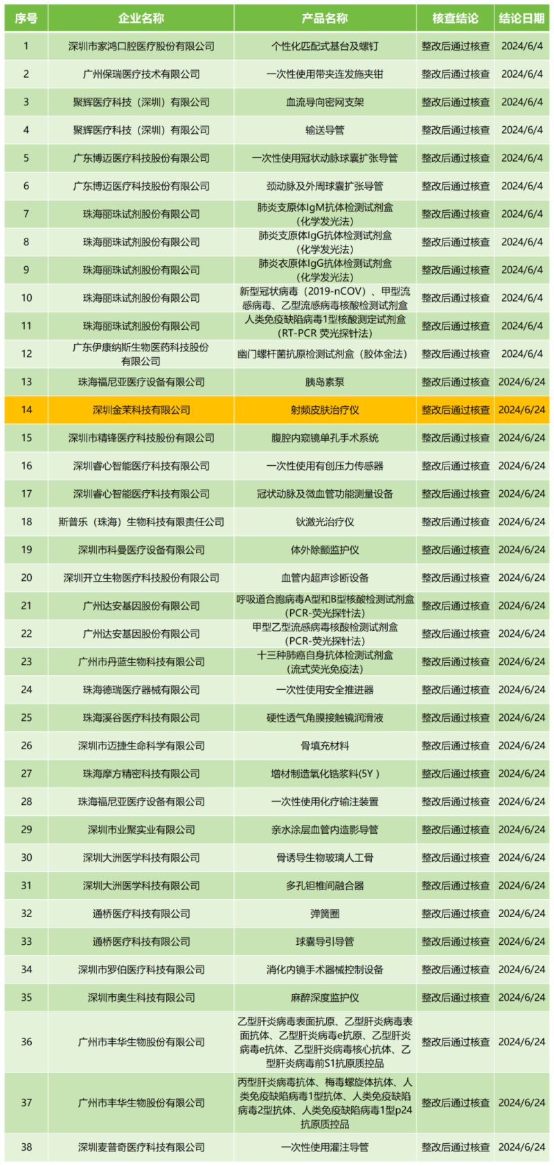 7月16日,廣東省藥監局官網公布2024年6月醫療器械注冊質量管理體系核查結果,包括深圳市家鴻口腔醫療股份有限公司的個性化匹配式基臺及螺釘、珠海福尼亞醫療設備有限公司的胰島素泵、深圳金茉科技有限公司的射頻皮膚治療儀等共計38款產品,均為“整改后通過核查”。具體明細見下方表格: