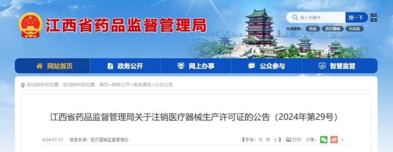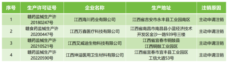 7月17日,江西省藥監局發布公告稱,該局已依法注銷江西海川藥業有限公司、江西萬鑫醫療科技有限公司等4家企業的《醫療器械生產許可證》,注銷原因均為“企業主動申請注銷”,具體明細如下: