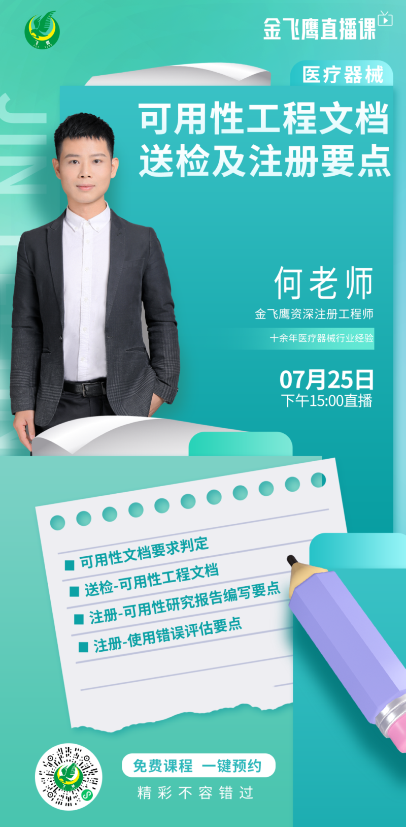 7月25日下午3點,金飛鷹資深注冊工程師,擁有十余年醫療器械行業經驗,對可用性工程頗有研究的何老師,繼續給大家帶來《醫療器械可用性工程文檔送檢及注冊要點》,培訓內容包括可用性文檔要求判定、送檢環節的可用性工程文檔要求、注冊環節的可用性研究報告編寫要點及使用錯誤評估要點,大家千萬不要錯過了哦!