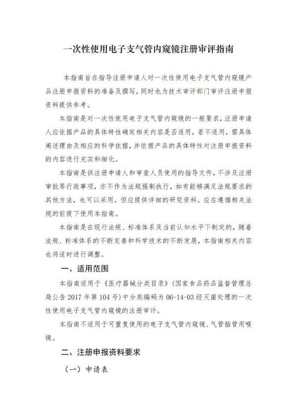 該指南適用于《醫療器械分類目錄》(國家食品藥品監督管理總局公告2017年第 104號)中分類編碼為06-14-03經滅菌處理的一次性使用電子支氣管內窺鏡的注冊審評。對可重復使用的電子支氣管內窺鏡、氣管插管用喉鏡不適用。