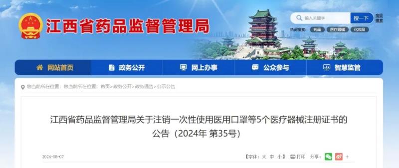 8月7日,江西省藥監局發布公告稱,按照《醫療器械監督管理條例》規定,根據企業申請,現注銷江西諾德醫療器械有限公司等3家企業的5個產品(含醫用口罩、注射泵等)的醫療器械注冊證書,具體明細如下: