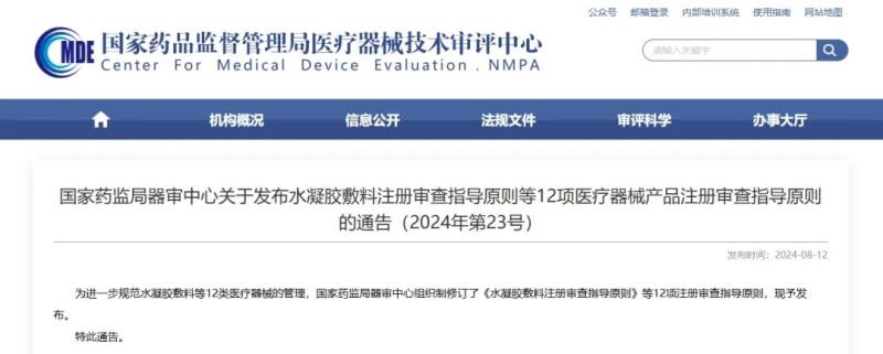 8月12日,國家藥監局器審中心發布《水凝膠敷料注冊審查指導原則》《透析液過濾器注冊審查指導原則》《一次性使用靜脈留置針注冊審查指導原則》等12項醫療器械注冊審查指導原則,具體清單如下: