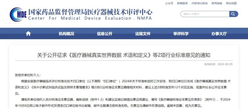 近日,國家藥監局器審中心發布《醫療器械真實世界數據 術語和定義》《體外診斷試劑臨床試驗生物樣本管理要求》等2項行業標準征求意見稿等相關材料,并向社會公開征求意見。