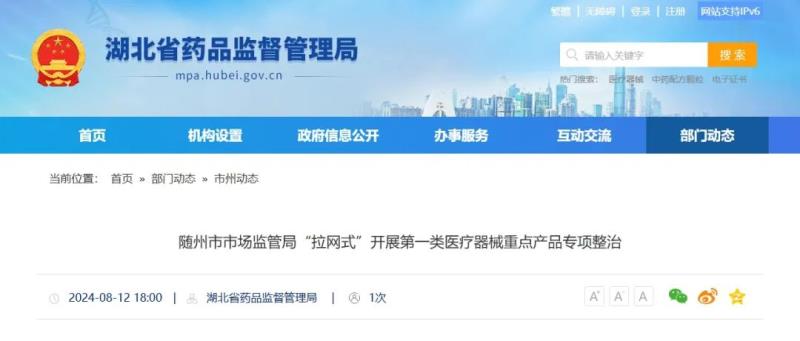 近日,湖北藥監局發布動態稱,為進一步規范第一類醫療器械備案、生產及經營行為,保障醫療器械質量安全,隨州市市場監督管理局根據《省藥品監督管理局辦公室關于開展第一類醫療器械重點產品專項監督檢查的通知》要求,在全市“拉網式”全面開展了第一類醫療器械重點產品專項整治。