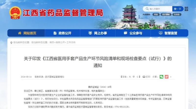 8月14日,江西省藥監局發布《江西省醫用手套產品生產環節風險清單和現場檢查要點(試行)》(以下簡稱《檢查要點》),作為各級藥品監督管理部門開展醫用手套產品監督檢查工作(包括質量管理體系審查、專項監督檢查、日常監督檢查等)和注冊核查工作的執行依據。