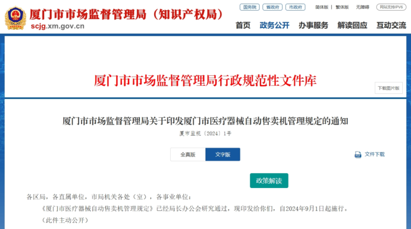 近日,廈門市市場監督管理局發布《廈門市醫療器械自動售賣機管理規定》(以下簡稱《管理規定》),對醫療器械經營企業設置自動售械機的備案流程予以明確,并對自動售械機的經營主體、經營范圍、基本原則以及質量管理體系等提出要求。