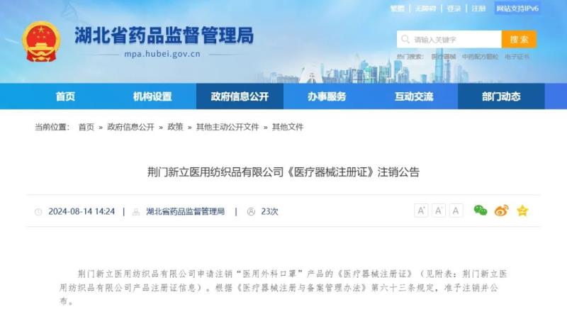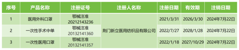 近日,湖北省藥監局發布了幾則注銷公告,其中提到,由于荊門新立醫用紡織品有限公司主動申請注銷其持有的幾張注冊證(含醫用外科口罩、一次性手術中單等產品),根據《醫療器械注冊與備案管理辦法》第六十三條規定,準予注銷并公布,具體明細如下: