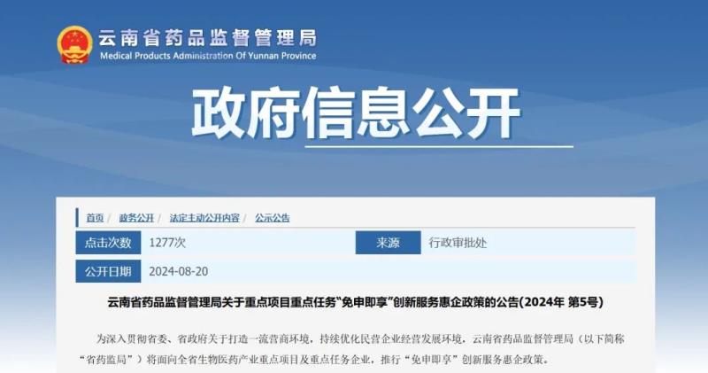 近日,云南省藥監(jiān)局發(fā)布公告稱,為深入貫徹省委、省政府關(guān)于打造一流營(yíng)商環(huán)境,持續(xù)優(yōu)化民營(yíng)企業(yè)經(jīng)營(yíng)發(fā)展環(huán)境,該局將面向全省生物醫(yī)藥產(chǎn)業(yè)重點(diǎn)項(xiàng)目及重點(diǎn)任務(wù)企業(yè),推行“免申即享”創(chuàng)新服務(wù)惠企政策。具體如下: