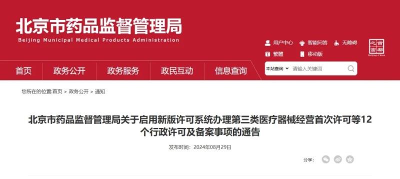 8月29日,北京市藥監局發布通告稱,自2024年9月1日起,第三類醫療器械經營首次許可、第一類醫療器械生產備案新辦等12個行政許可及備案事項(詳見下方表格)使用新版許可系統辦理。上述事項的原申報入口同步關閉。