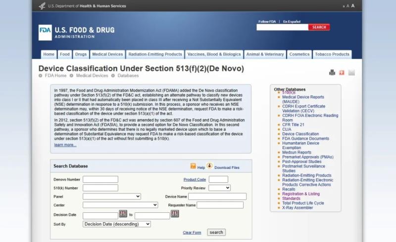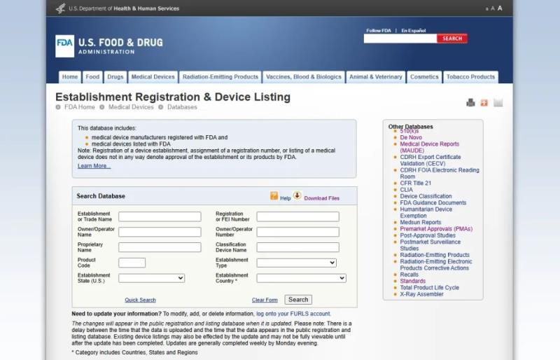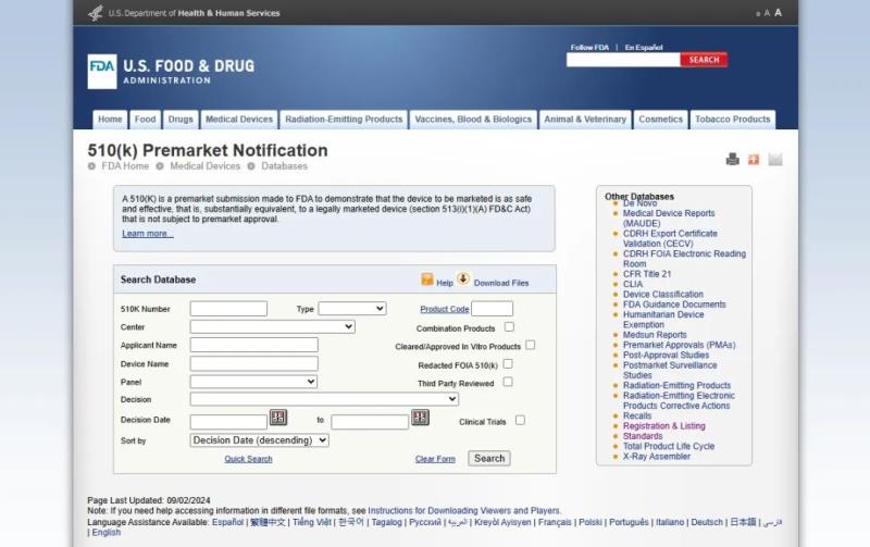 該數據庫包含所有通過510(k)路徑在美國上市的醫療器械信息。值得注意的是,該網址有一個最近更新日期,部分剛拿到510(k)號的產品可能查詢不到,等FDA官網信息更新后即可查詢。