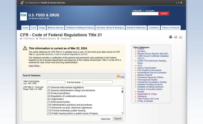 該數據庫能夠提供FDA監管范圍內產品相關的所有法規在線瀏覽,醫療器械相關的法規在第800-898章節(21 CFR part 800-898),用戶可以隨時檢索醫療器械相關法規。當然,如該頁內容所述,這里的法規內容是一年更新一次的,假如需要獲取最新法規,可跳轉至實時更新的CFR電子版