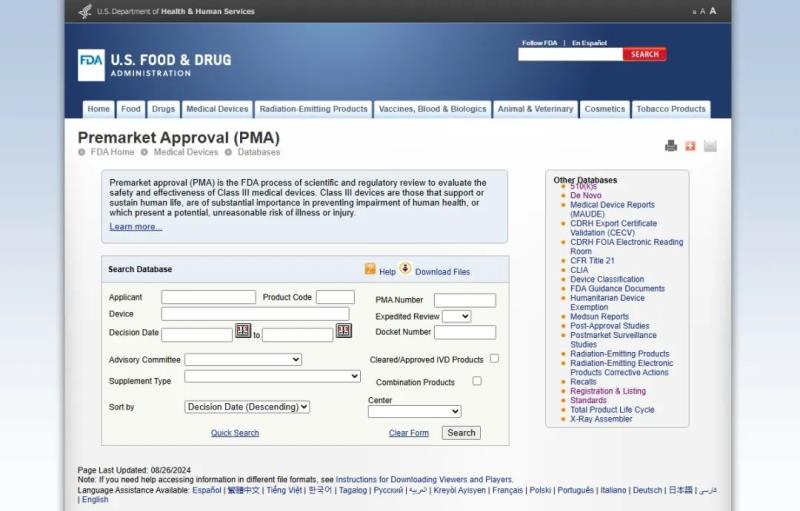 該數據庫包含所有通過PMA路徑在美國上市的高風險醫療器械的信息。