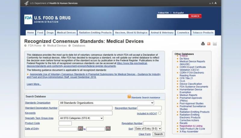 該數據庫包含了所有FDA認可的協調標準,可以通過標準組織、標準編號、關鍵詞等信息進行檢索。