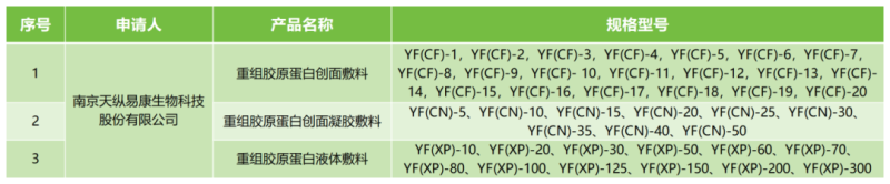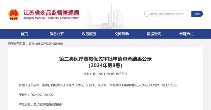 近日,江蘇省藥監(jiān)局發(fā)布《第二類醫(yī)療器械優(yōu)先審批申請審查結(jié)果公示(2024年第8號)》,共有3款重組膠原蛋白敷料產(chǎn)品,具體如下: