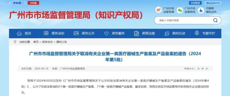 9月18日,廣州市市場監督管理局官網發布一則取消第一類醫療器械生產備案及產品備案的通告,通告指出,因廣東嘉雅醫療器械有限公司、廣州市歐之康醫療器械有限公司未在備案場所經營且無法聯系,在公示期間該局及各區市場監管局未收到相關企業提出的異議。