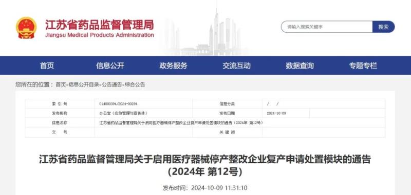 近日,江蘇省藥監局發布《關于啟用醫療器械停產整改企業復產申請處置模塊的通告》,其中提到,自2024年10月15日起,江蘇省藥品監督管理局決定啟用醫療器械停產整改企業復產申請處置模塊。具體通告內容如下: